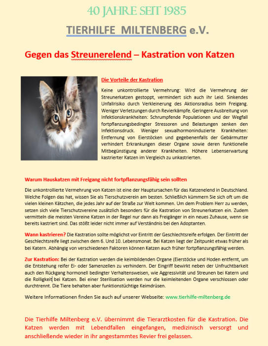 Engagement gegen das Elend der Straßenkatzen in DeutschlandIn Deutschland leben rund zwei Millionen Katzen auf der Straße - immer auf der Suche nach Futter;sie sind ausgemergelt, schwach und krank. Viele sterben qualvoll.Ursache dieses Tierleids sind auch unkastrierte Hauskatzen; Nur wenige Menschen lassen ihreKatze kastrieren; so zeugen Freigänger weiter Nachwuchs mit Streunern, und die Streunerkatzenvermehren sich immer weiter. Die Zahl der Nachkommen von nur einer Katze steigt so nach nur vier Jahren in die Tausende!Die einzig sinnvolle und tiergerechte Methode, um die Population der Streunerkatzen einzudämmen, ist die Kastration. Dabei reicht es nicht nur die Streuner zu kastrieren - auch jeder Katzenhalter trägtVerantwortung und muss seine Katze kastrieren lassen.Quelle: tasso.netFoto: Tierschutzbund.de